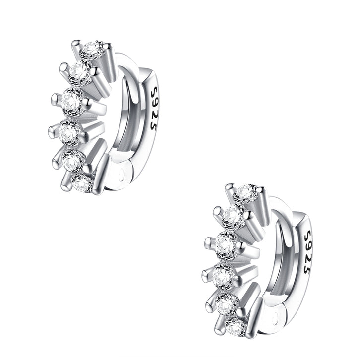 Crafted from sterling silver. Set with six tiny zircon gemstones. Fastened with hinge clasp. Diameter under 0.5 cm. Sold as a pair.