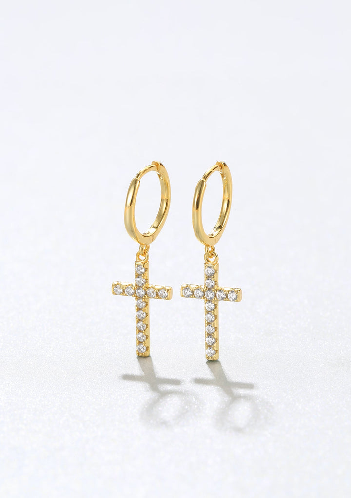 Handcrafted in 925 sterling silver. Cross pendant set with small clear zirconia stones. Available in 18K gold-plated, 18K rose gold-plated, and sterling silver. Hoop diameter approximately 15 mm. Huggie clasp closure.