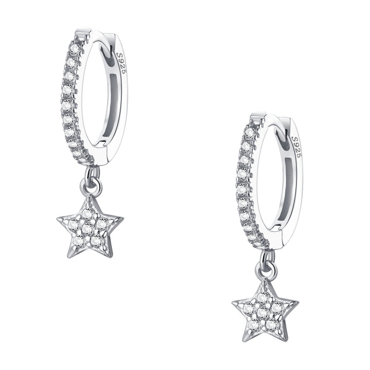 Made from sterling silver. Features zirconia stones on hoops (11) and star pendants (6). Hinged opening with thin ear pieces. Sold as a pair.