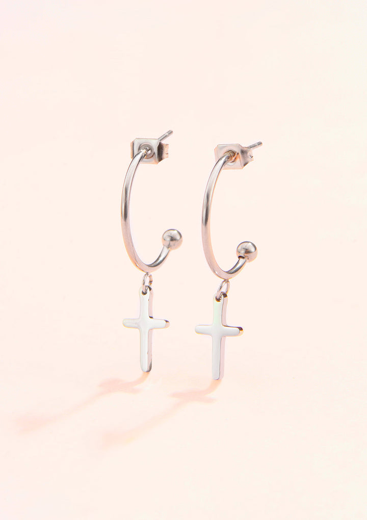 These Cross Hoop Earrings by Hey Happiness are thin, 3/4 hoop earrings crafted from stainless steel, featuring a tiny cross pendant hanging from the lower edge and a metallic bead on the back edge. The earrings thread through the earlobe with a thin earpiece and secure with silver butterfly clasps. Their dainty, streamlined design offers a subtle blend of faith and modern style, making them a versatile addition to any outfit—from casual denim to fitted dresses.