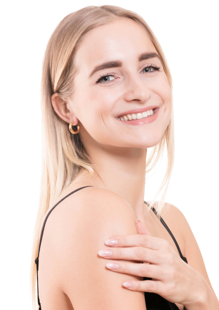 These Small Round Hoop Earrings by Hey Happiness are 3/4 golden hoops with softly rounded edges. They fasten securely with a thin ear piece and golden butterfly clasps. Their refined, graceful silhouette makes them ideal for any occasion, from casual catch-ups to formal events.