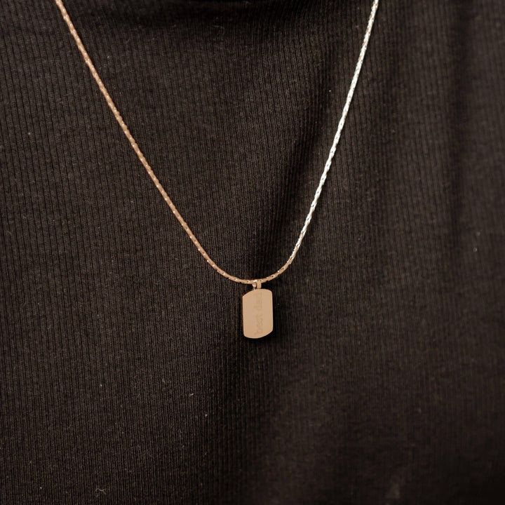 Stainless steel with waterproof finish. Rectangular tag pendant with engraved text.