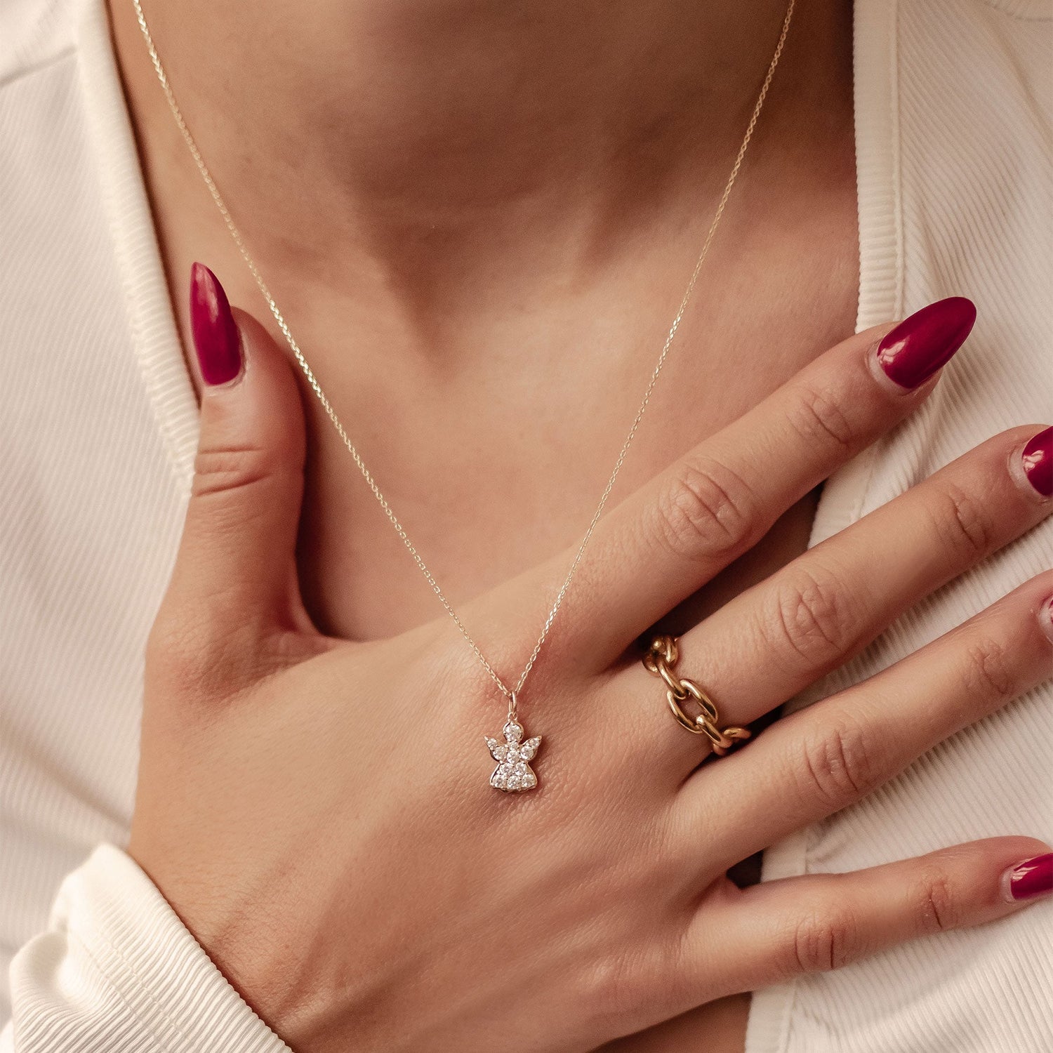 This Angel Protector Pendant Necklace 14K Gold by Hey Happiness combines spiritual symbolism and refined style with a solid 14K gold pendant featuring an angel filled with sparkling zirconia stones. Designed for everyday wear, it offers protection and guidance in a stunning accessory.
