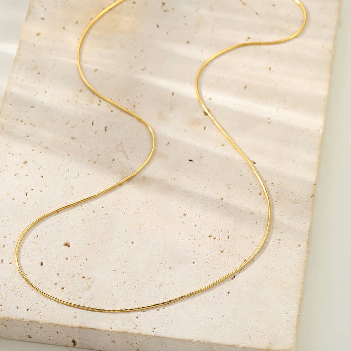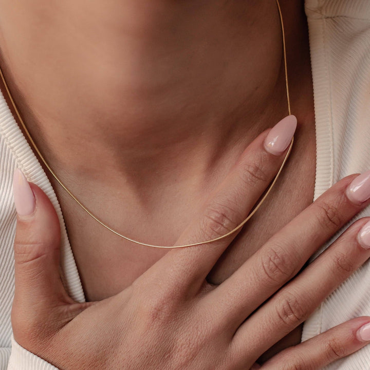 This Round Snake Chain Necklace by Hey Happiness features a smooth, flexible design made from small individual links woven tightly to resist tangling. Crafted in sterling silver, it closes with an oval lobster claw clasp and includes a short extension chain for adjustable length. Ideal for wearing alone or paired with your favorite pendants.