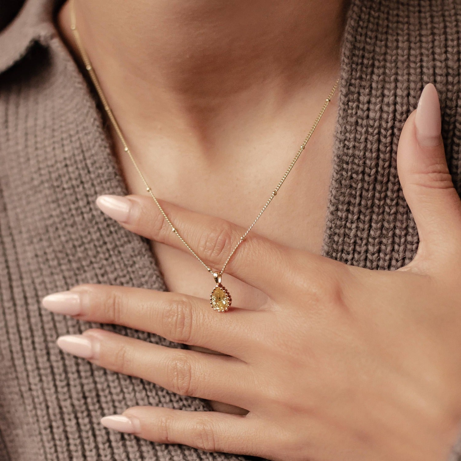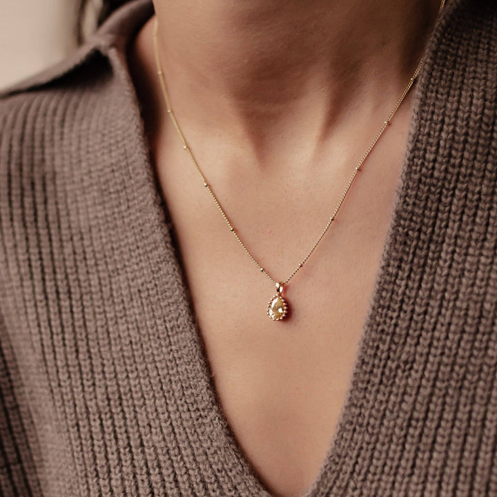 This November Topaz Birthstone Necklace by Hey Happiness channels the passion and intuition of Scorpio and Sagittarius zodiac signs. The sterling silver pendant, set with a teardrop-shaped Topaz gemstone, radiates strength, protection, and healing energy. Perfect for wearing close to the heart, this necklace is both a meaningful talisman and a luminous accessory for everyday elegance. Available in gold, rose gold, and silver finishes.