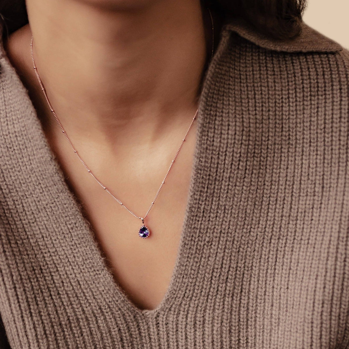 Handcrafted in 925 sterling silver with a teardrop-shaped Amethyst gemstone approximately 12 mm. Pendant suspended from a 16-inch (40 cm) chain with spring ring clasp. Available in sterling silver, 18 karat gold-plated sterling silver, and rose gold-plated sterling silver.
