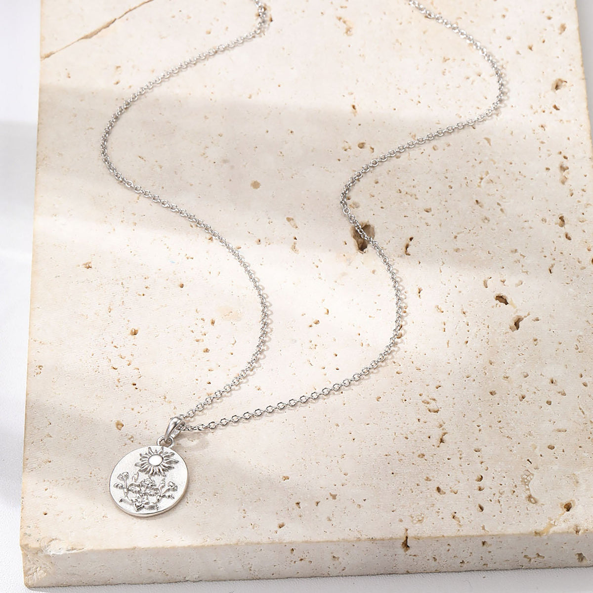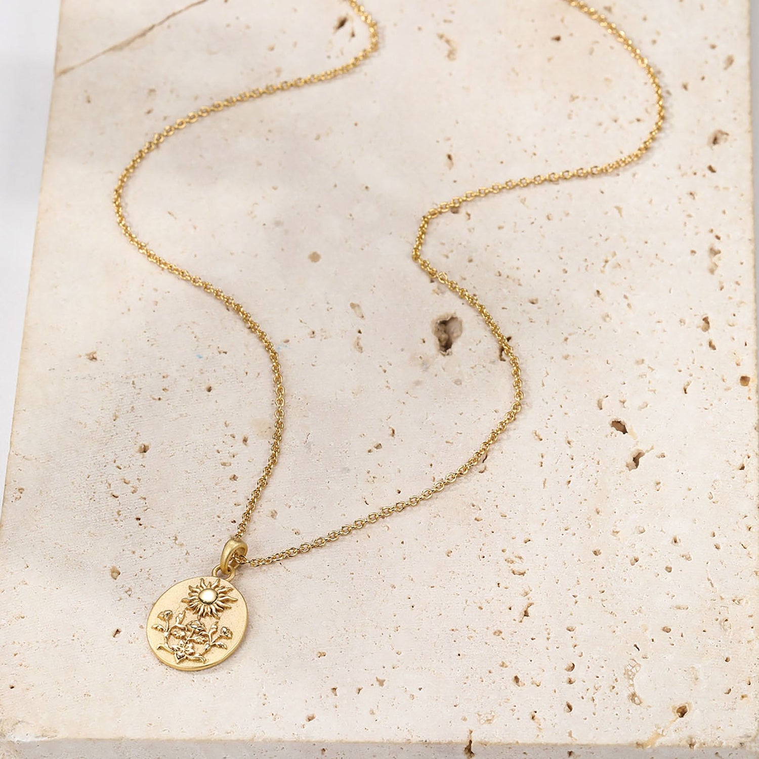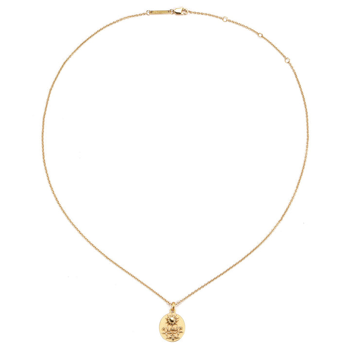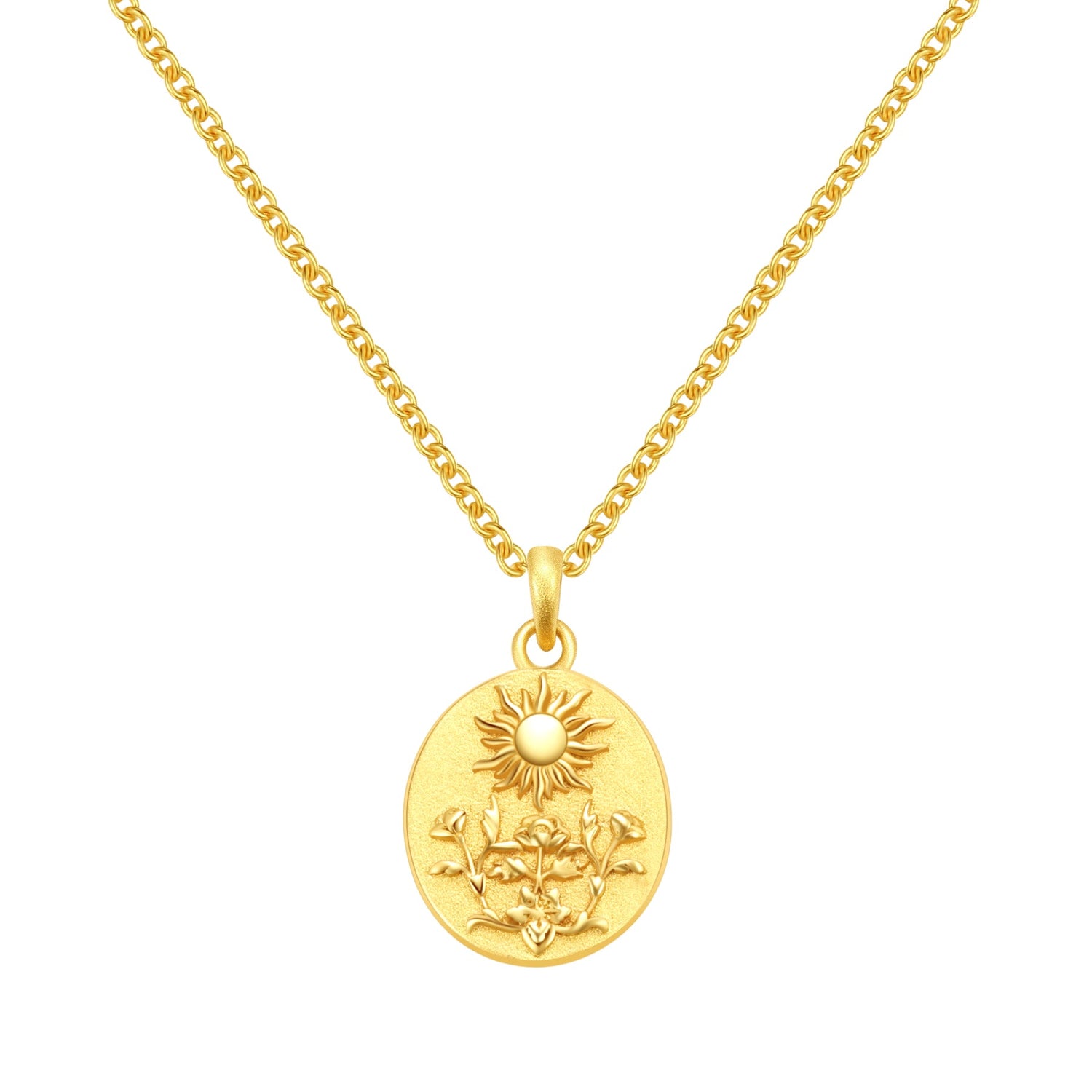 The Sunshine Pendant Necklace by Hey Happiness features an oval pendant with a radiant sun motif above a garden bed, symbolizing energy and life. Crafted with a matte finish, it hangs on a fine chain that fastens with a lobster claw clasp and adjustable jump rings. Available in 18 karat gold-plated sterling silver or plain sterling silver, it radiates positivity and vitality.