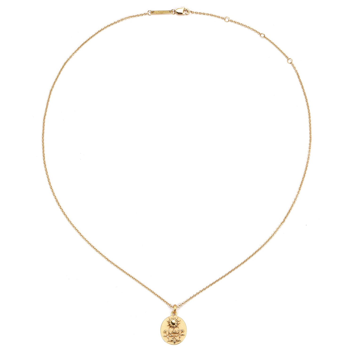 Made from 18 karat gold-plated sterling silver or plain sterling silver. Oval pendant with matte finish and sun design. Lobster claw clasp and adjustable jump rings.