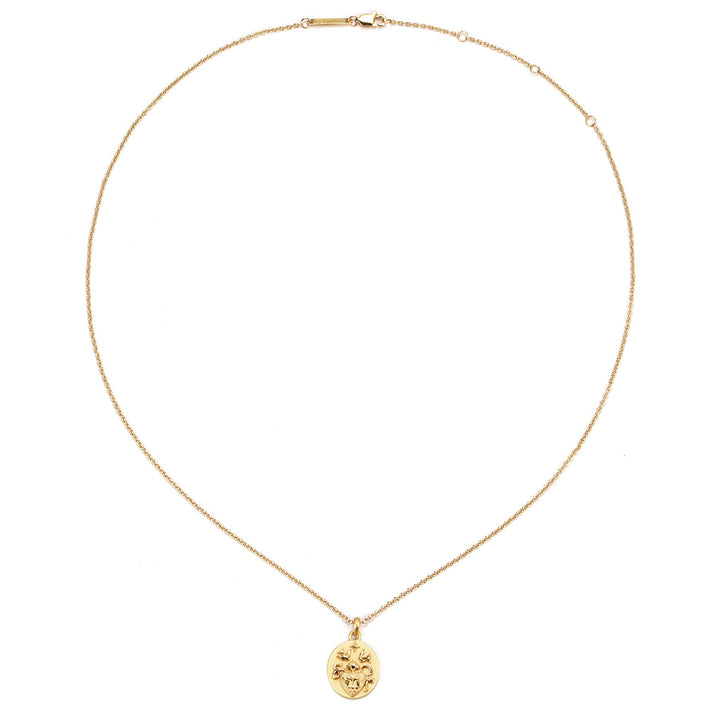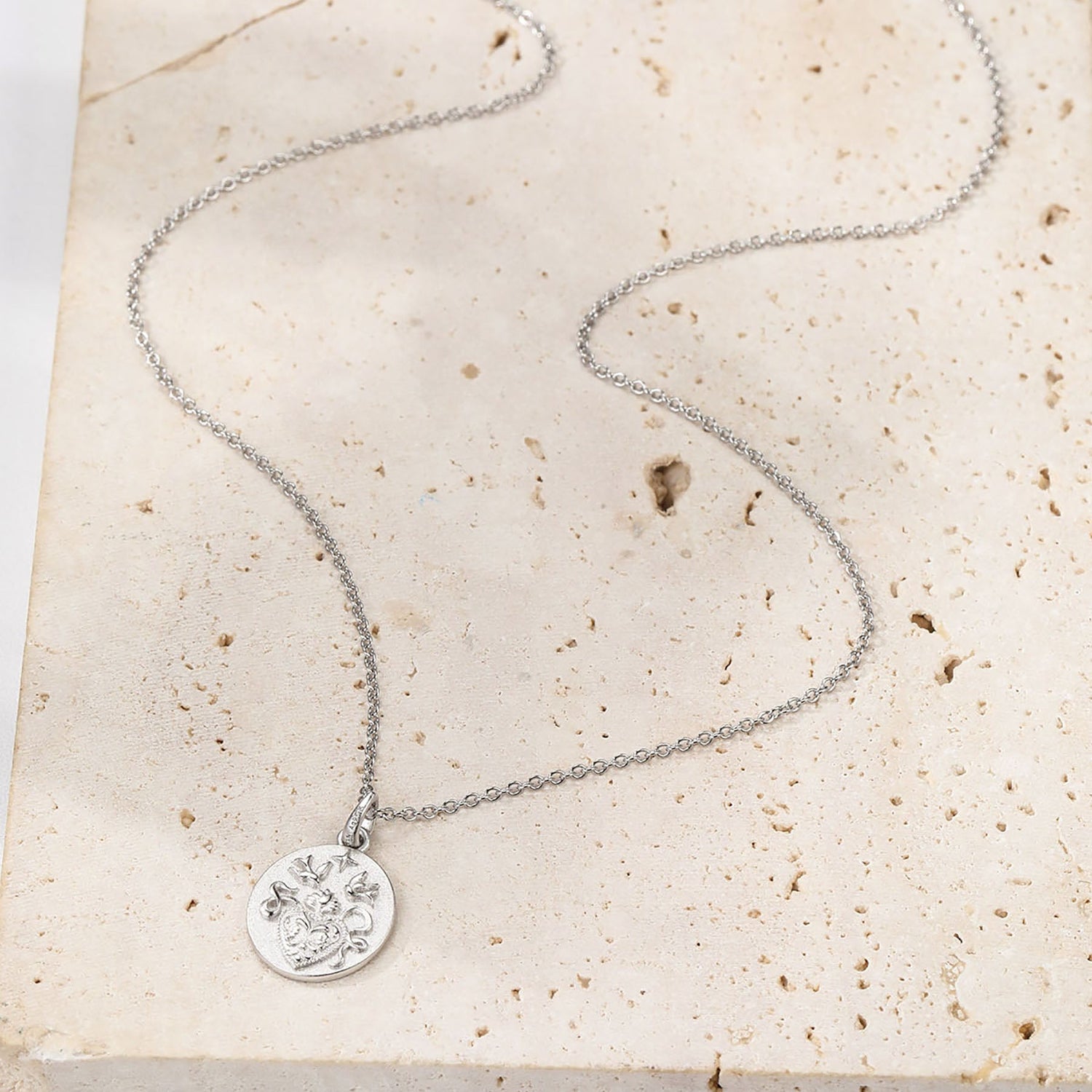 This Nurturer Pendant Necklace by Hey Happiness celebrates tenderness and care with an oval-shaped pendant featuring a central heart, ribbons, birds, and a star motif. Crafted in either 18 karat gold-plated sterling silver or plain 925 sterling silver, it hangs from a fine chain with an adjustable lobster claw clasp and four jump rings for customizable length. A daily wearable piece that encourages self-nurturing and connection.