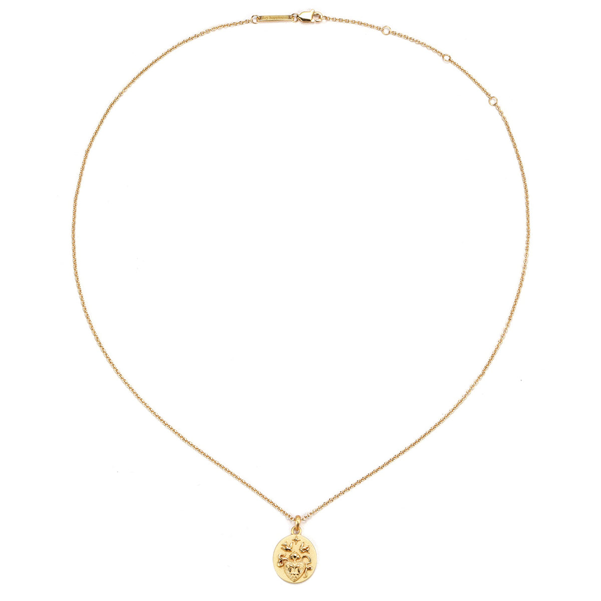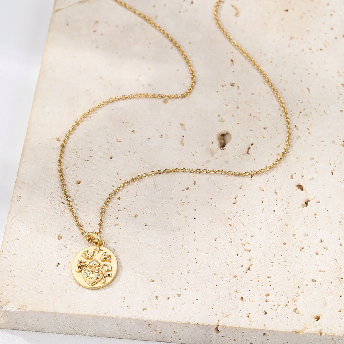 Available in 18 karat gold-plated sterling silver or 925 sterling silver. Pendant with detailed engraving. Adjustable chain with lobster claw clasp and multiple jump rings.