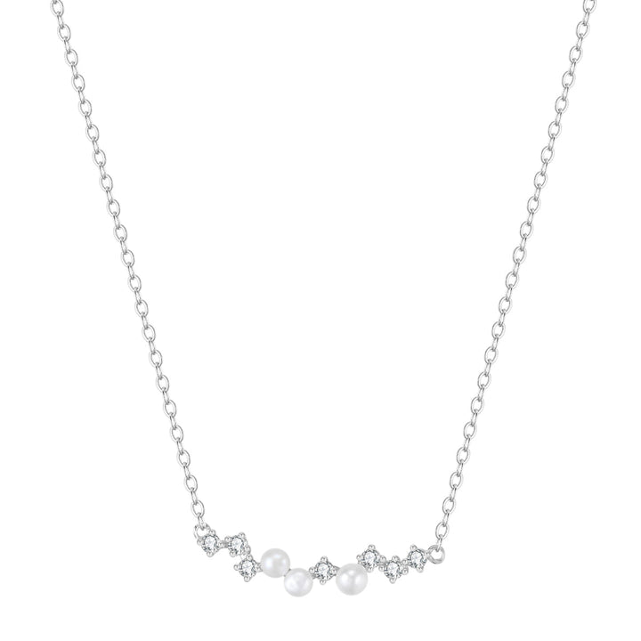Made from sterling silver with seven zirconia stones and three freshwater pearls. Available in gold and silver finishes. Pendant only.