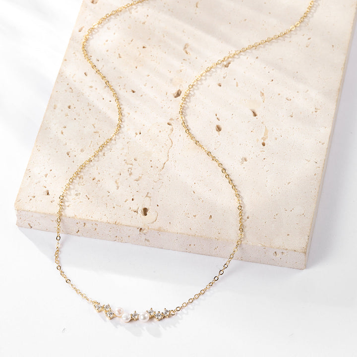 The Cluster Pearl Pendant Necklace by Hey Happiness is a bold sterling silver statement piece featuring a cluster of seven zirconias and three freshwater pearls. Available in gold and silver, it adds glamour and sophistication to any outfit, perfect for making a striking impression.
