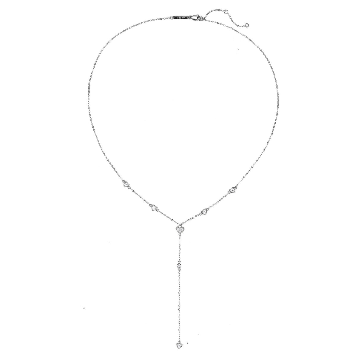 This Cherish Y Chain Necklace by Hey Happiness is a romantic 925 sterling silver piece plated in 18 karat gold. It features a Y-shaped design with six heart-shaped charms encrusted with zirconia stones—five smaller hearts distributed along the main chain and one larger heart positioned at the center front. The necklace fastens with a lobster clasp and adjustable extension chain, ideal for showcasing with simple necklines.