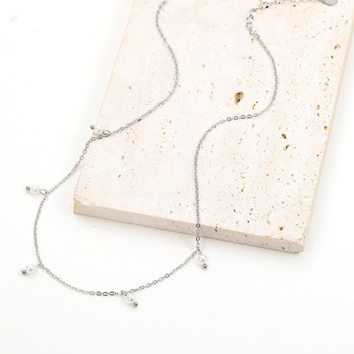 This Cinque Pearl Chain Necklace by Hey Happiness is a refined stainless steel piece featuring five evenly spaced small faux pearls along the front. It fastens with an oval-shaped lobster claw clasp and includes a short extension chain finished with a tiny seashell charm for adjustable length. This elegant necklace adds a polished touch to special occasions or everyday casual wear.