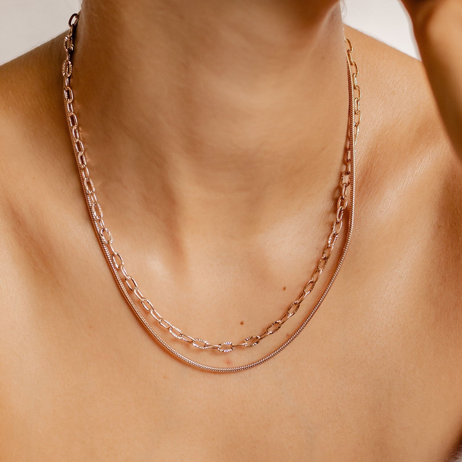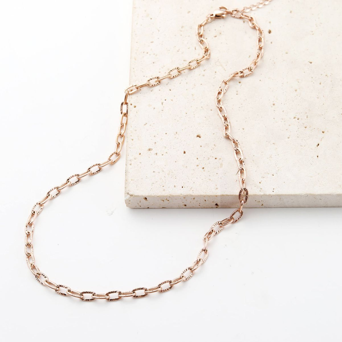 This Textured Link Chain Necklace Rose Gold by Hey Happiness is made from rose gold-plated stainless steel featuring interlocking oval links with a textured surface for subtle visual interest. The chain fastens with a lobster claw clasp and includes a short extension chain with a signature seashell pendant, offering adjustable length and timeless appeal.