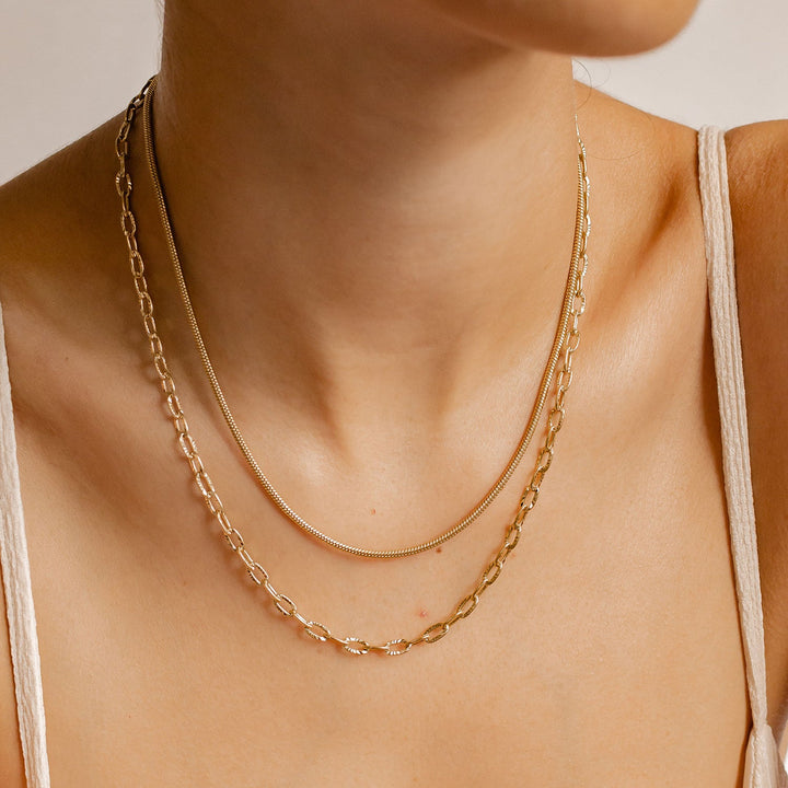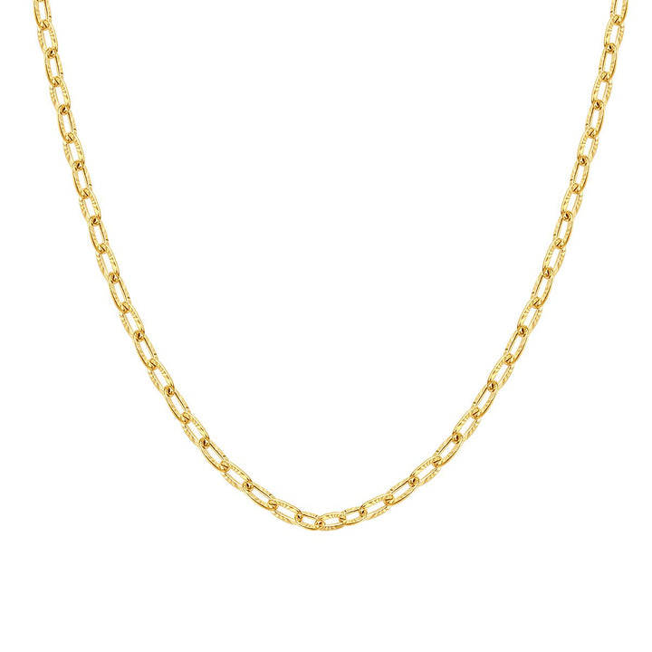 This Textured Link Chain Necklace Gold by Hey Happiness is crafted from 18-karat gold-plated stainless steel, featuring large oval links with a textured surface. It fastens with a lobster claw clasp and includes a short extension chain with a hanging shell pendant for adjustable length. A striking yet versatile statement necklace.