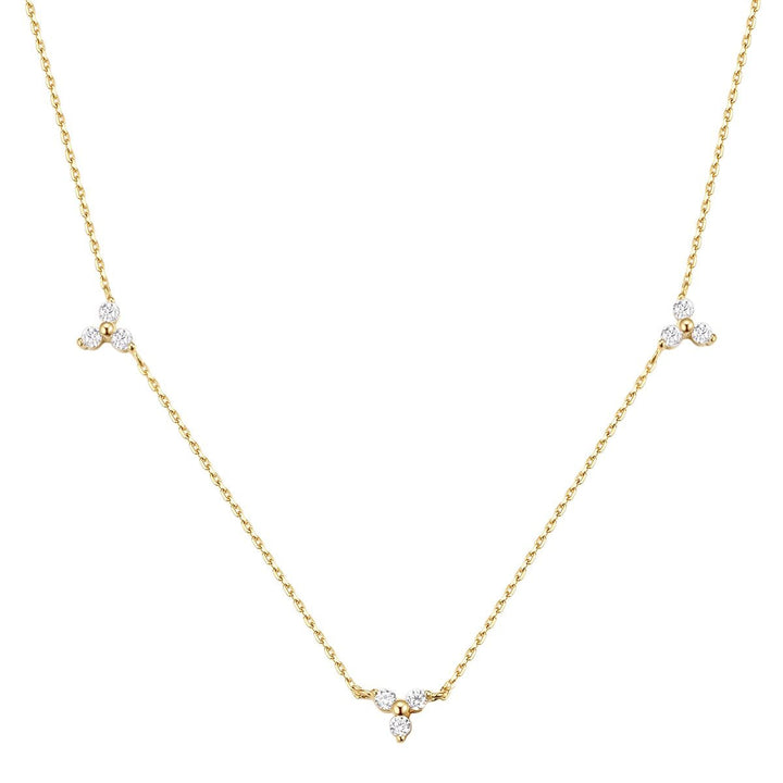 Made from 14 karat 585 solid gold with three zirconia flower pendants. Fine gold chain with secure clasp.