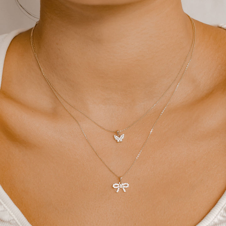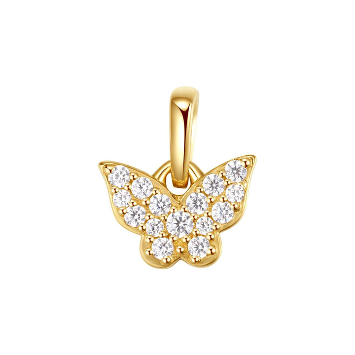 This Evolve Pendant Necklace by Hey Happiness symbolizes transformation and growth through its delicate butterfly-shaped pendant, encrusted with 15 tiny zirconia stones. Crafted from 14 karat 585 solid gold, the fine chain features a spring clasp and short extension chain for adjustable length. The removable pendant serves as an elegant reminder of personal evolution and resilience. Pendant available separately for versatile styling.