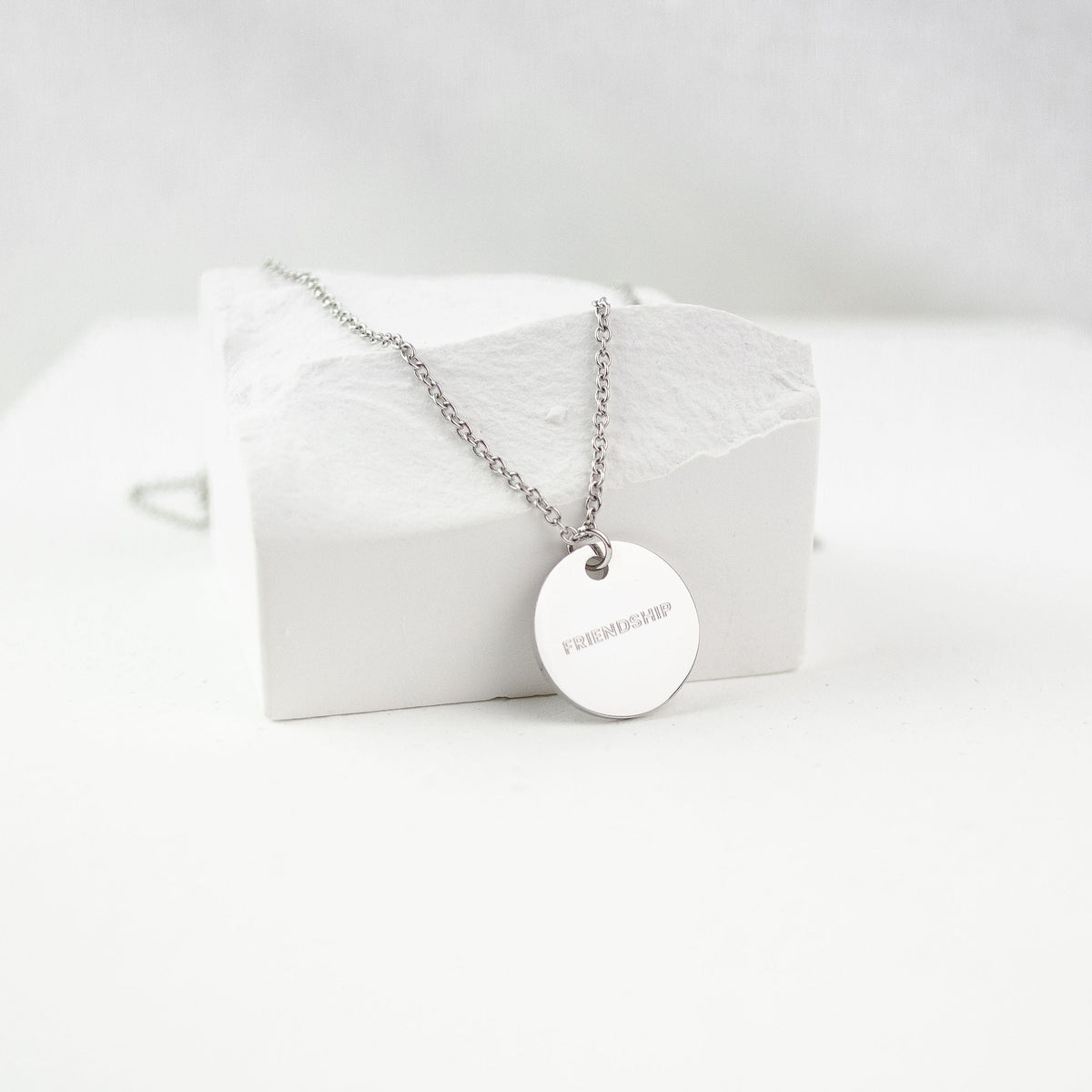 This Circle Necklace Silver by Hey Happiness is a minimalist staple, showcasing a thin sterling silver chain with an adjustable clasp and a single silver disc pendant centered at the front. Its simple yet stunning design complements casual and formal wear alike, offering a timeless versatility.