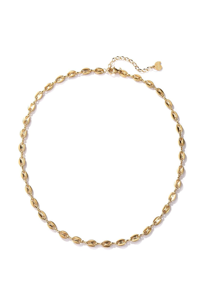 This Puffed Mariner Chain Necklace by Hey Happiness is made from 18K gold-plated stainless steel with chunky oval-shaped ‘puffed mariner’ links featuring two holes each, connected by figure-eight shaped hardware. It fastens with a spring clasp and extension chain, offering a versatile and timeless accessory.
