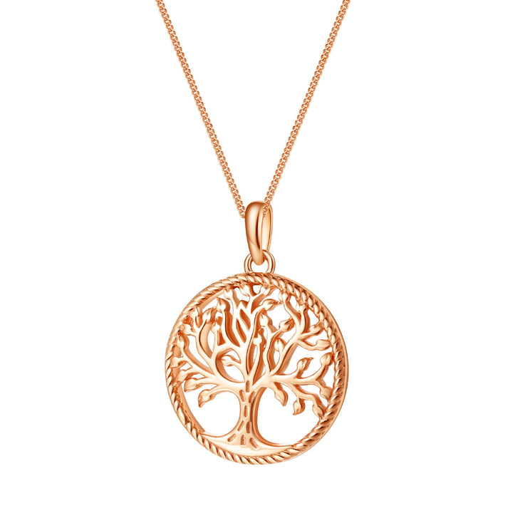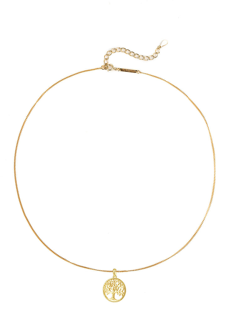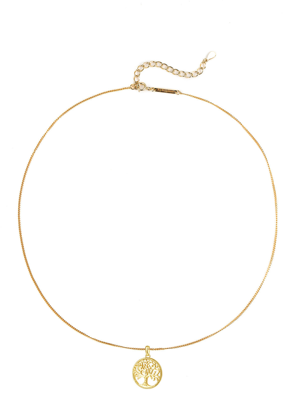 Made from 18 karat gold-plated sterling silver. Fine textured chain with Tree of Life pendant. Round spring clasp and adjustable extension chain (46 cm length).