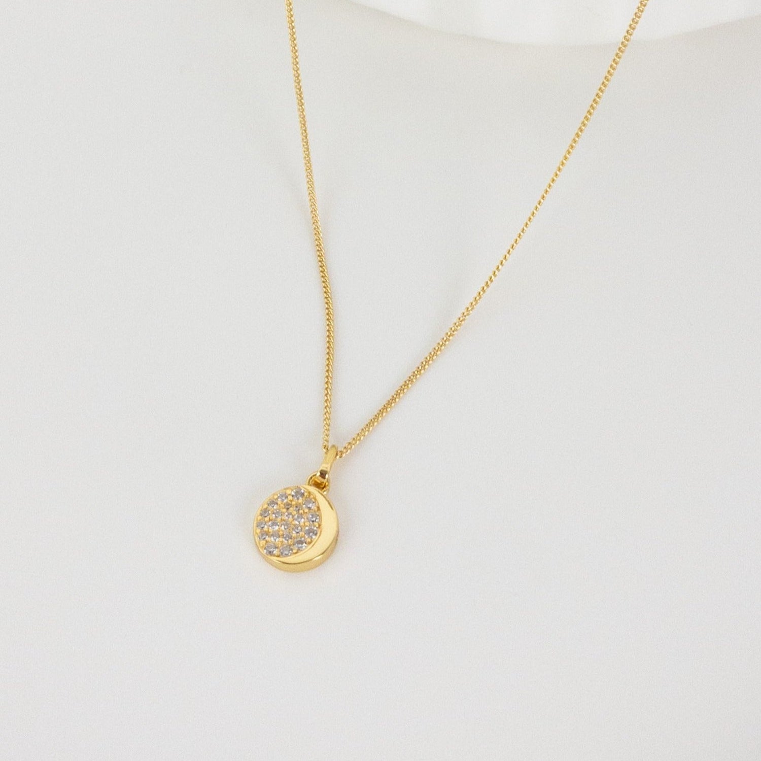 Handcrafted in 18 karat gold-plated sterling silver. Features a thin textured chain with round spring clasp and extension chain. Pendant includes a golden crescent moon and zirconia stone accents. Length approx. 46 cm (18 inches).