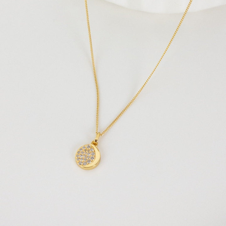 This Zirconia Moon Pendant Necklace by Hey Happiness is a refined 18 karat gold-plated sterling silver piece that pairs a thin textured chain with a round pendant showcasing a smooth golden crescent moon flanked by tiny zirconia stones. Elegant and versatile, this adjustable necklace seamlessly transitions from day to night, complementing a wide range of outfits.