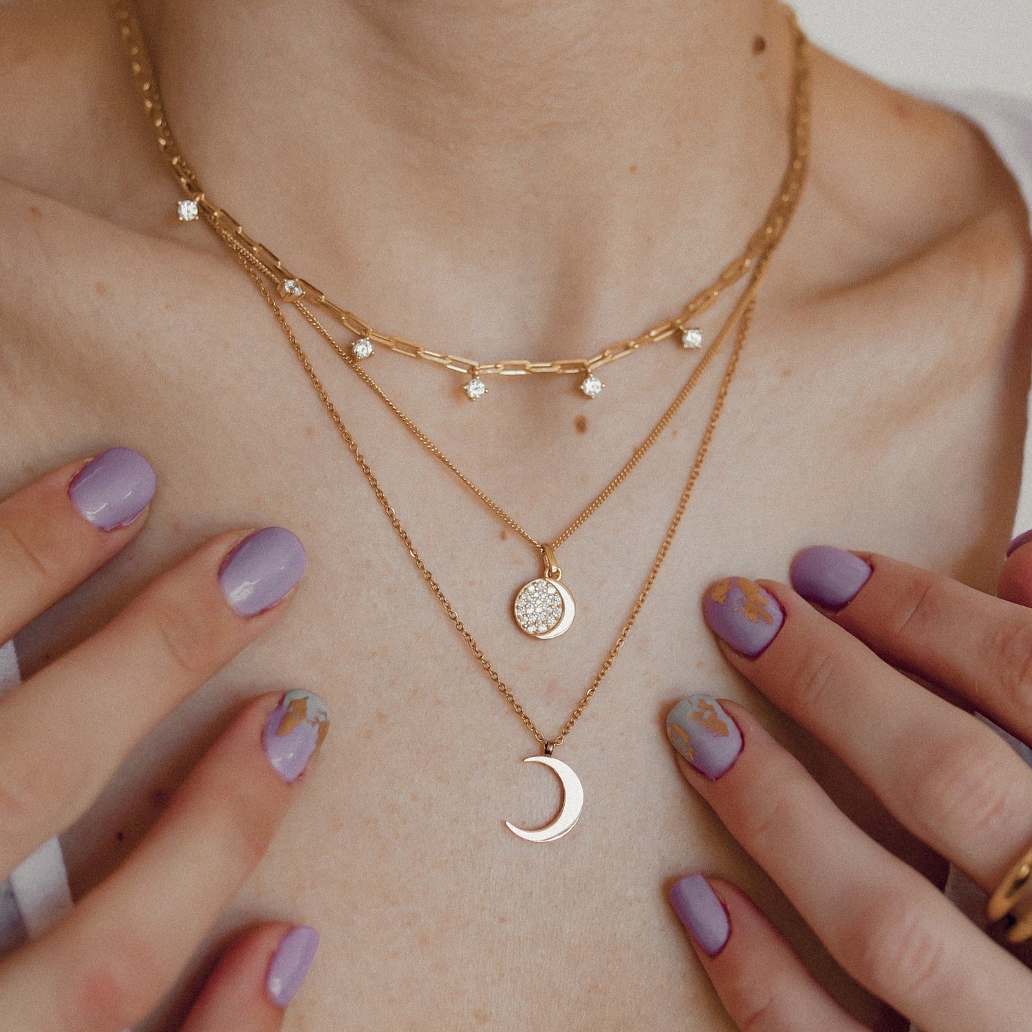 This Moon Pendant by Hey Happiness is crafted from 18 karat gold-plated sterling silver and features a small round pendant with a smooth golden crescent moon on the right side. The left side is adorned with clusters of zirconia stones—seven larger stones around the edge and fifteen smaller stones in the center—adding sparkle and elegance. The plain bail makes it easy to pair with chains of your choice. A delicate, romantic, and timeless accessory.
