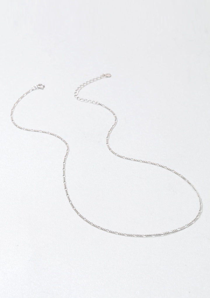 This Fine Figaro Chain Necklace by Hey Happiness is crafted from 925 sterling silver in a classic Figaro style, alternating one oval-shaped link with three round links throughout. It fastens at the center back with a round spring clasp and includes a short extension chain made of larger round links for adjustable length. A stylish, timeless chain ideal for pairing with pendants or layering.