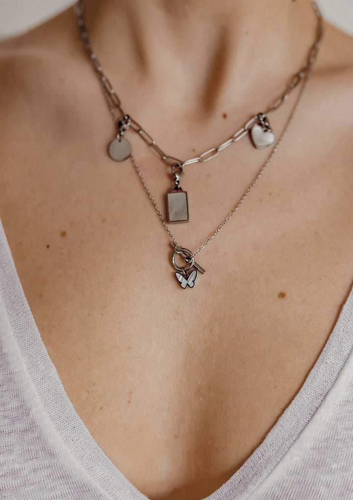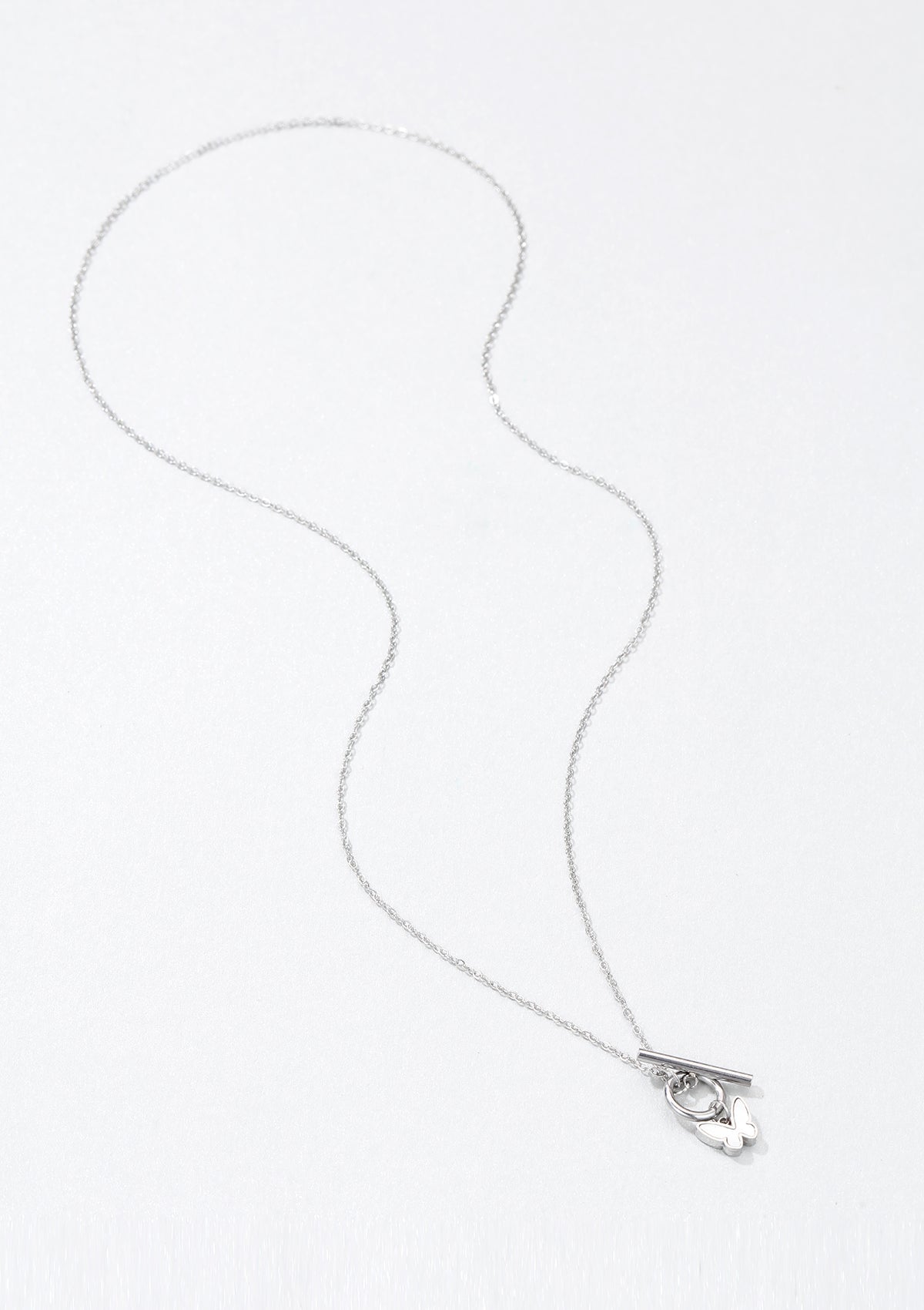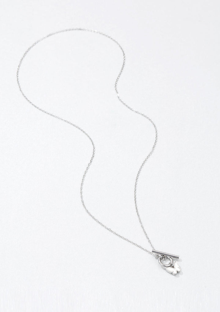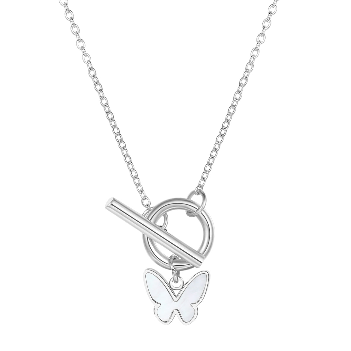 This Butterfly Pendant T-Bar Necklace by Hey Happiness is a delicate and feminine statement piece. Crafted from stainless steel, it features a fine chain that fastens at the front with a distinctive T-bar closure—a thin rod threading through a hollow circle. Hanging from the circle is a small butterfly charm inset with iridescent shell, adding a touch of shimmer and whimsy. Perfect for year-round wear and effortless layering.