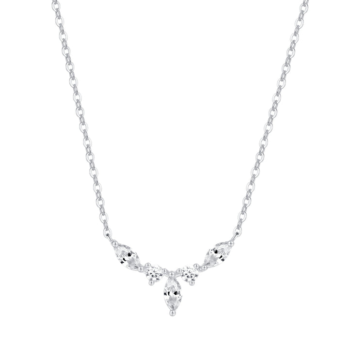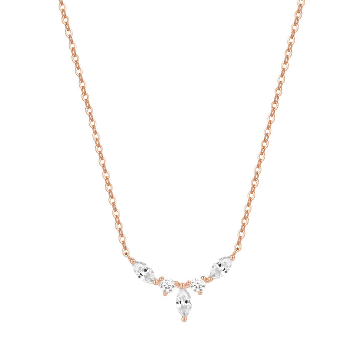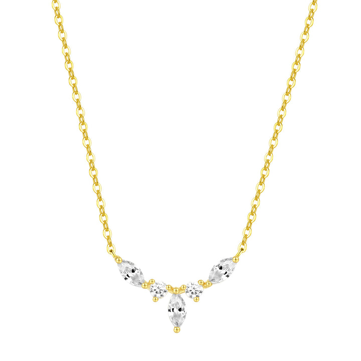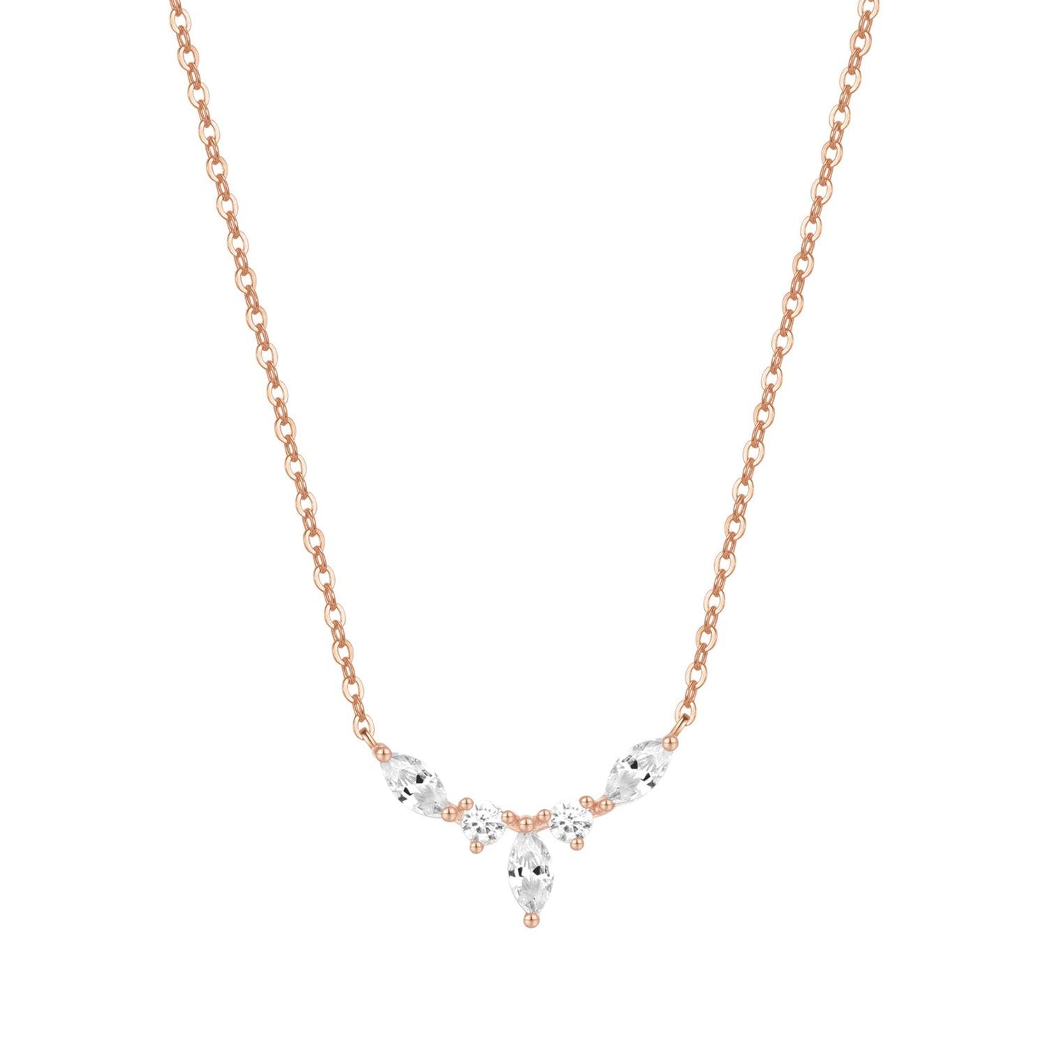 This Gemstone Crown Necklace Sterling Silver by Hey Happiness features a super fine sterling silver chain adorned with five clear zirconia stones: two small rounds and three oval shapes, with the central oval stone dangling vertically for dynamic movement. A round spring clasp and short extension chain with a ‘925’ stamped tag provide adjustable sizing. Available in 18K gold plated, 18K rose gold plated, and silver finishes, this refined and timeless necklace suits casual to evening wear.