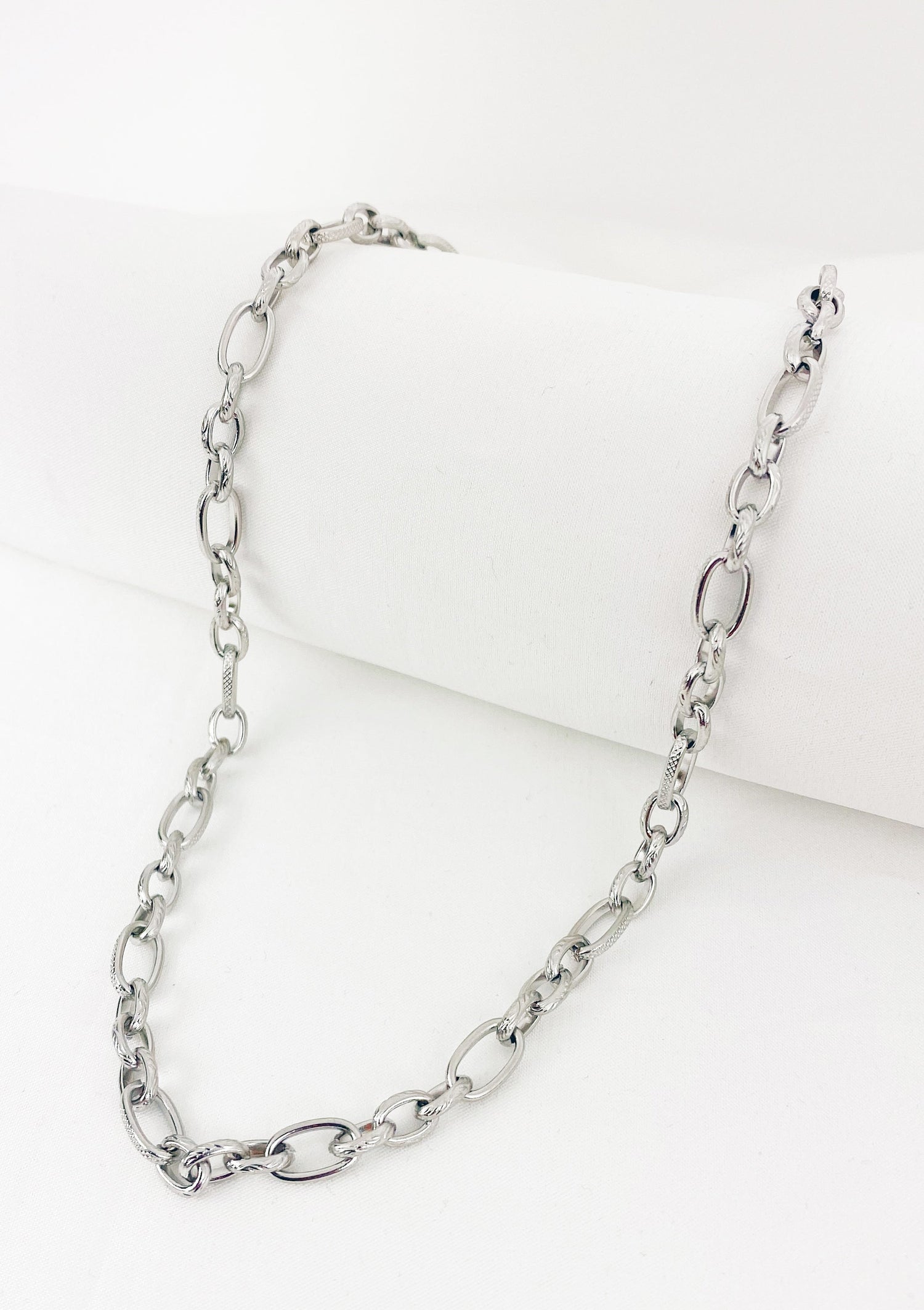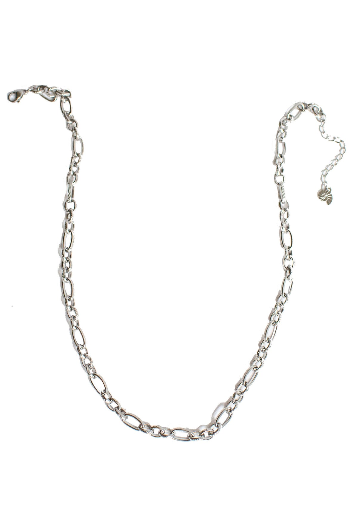 This Chunky Oval Figaro Chain Necklace Silver by Hey Happiness is a bold yet versatile stainless steel necklace featuring rounded oval links arranged in the classic Figaro pattern with a subtle textured finish. Fastened with an oval lobster clasp and adjustable extension chain with a shell pendant, it’s perfect layered or worn solo.