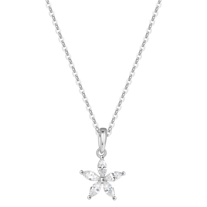 Crafted from 925 sterling silver. Chain necklace with flower-shaped pendant of five marquise-cut zircon stones. Spring clasp and adjustable extension chain.