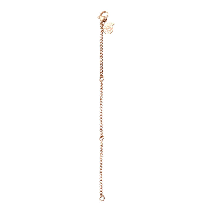 Stainless steel chain extension with oval lobster claw clasp and signature seashell charm. Three circular links at 3.5 cm, 7 cm, and 10.5 cm for adjustable length. Available in 18K Gold plated, 18K Rose Gold plated, and Silver finishes.