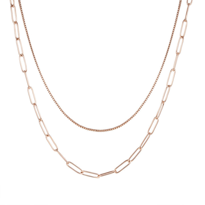 This Chunky Chain Layered Necklace by Hey Happiness in rose gold-plated stainless steel combines two chains of differing lengths: a shorter box chain with small square links and a longer chain with larger oval links. Joined at the back with an oval spring clasp and adjustable extension chain featuring a shell charm, it’s an understated yet elegant piece that suits casual and formal wear alike.