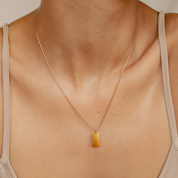 This Rectangle Pendant Necklace by Hey Happiness is a contemporary design crafted entirely from 18 karat gold-plated stainless steel. The smooth, unembellished rectangular pendant hangs from a tubular snake chain, delivering a polished and modern feel. Secured by a lobster claw clasp at the back with an adjustable link chain and signature shell charm, it offers versatility in length for the perfect fit. This refined necklace shines equally on its own or layered with other fine chains, adding understated sophistication to any outfit.