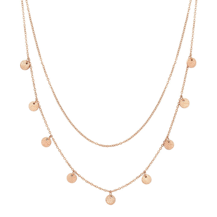 This Textured Circle Layered Necklace by Hey Happiness in rose gold-plated stainless steel features two chains of different lengths, one higher on the chest and one lower, with the longer chain adorned by nine small textured circular pendants. The necklace fastens with a lobster claw clasp and adjustable extension chain with a shell pendant, combining classic design with a feminine edge.