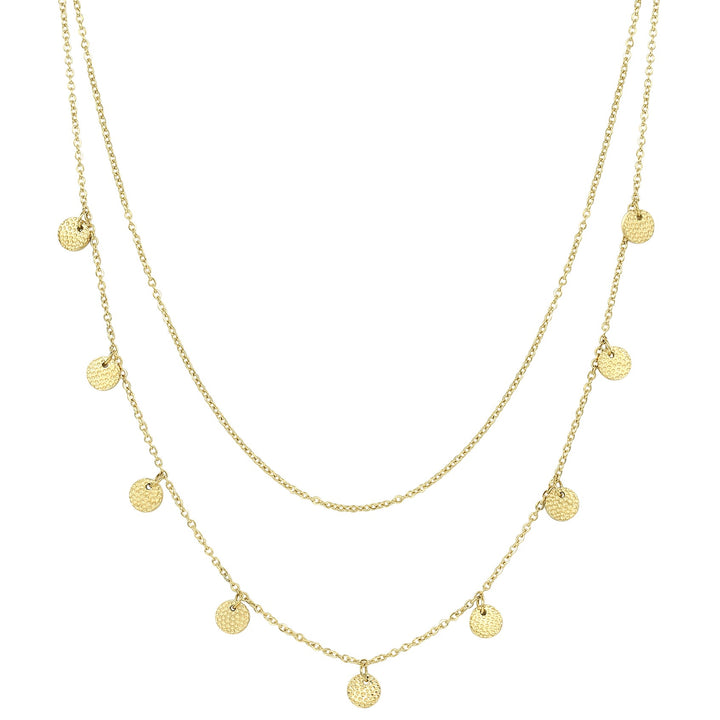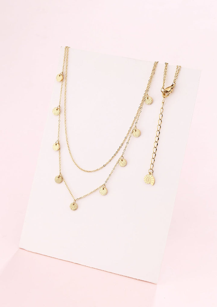 Crafted from 18 karat gold-plated stainless steel. Dual chain lengths connected and fastened with a lobster claw clasp. Includes adjustable larger link extension chain with seashell charm. Pendant details: nine textured circular discs.