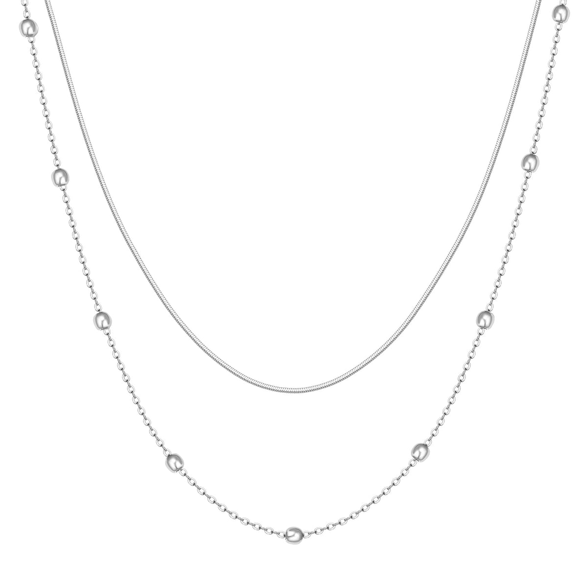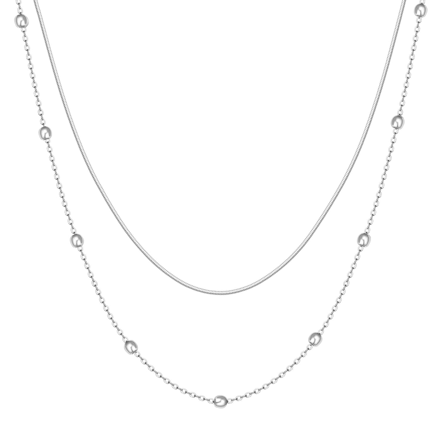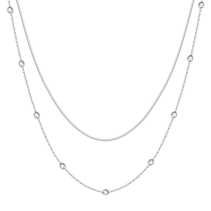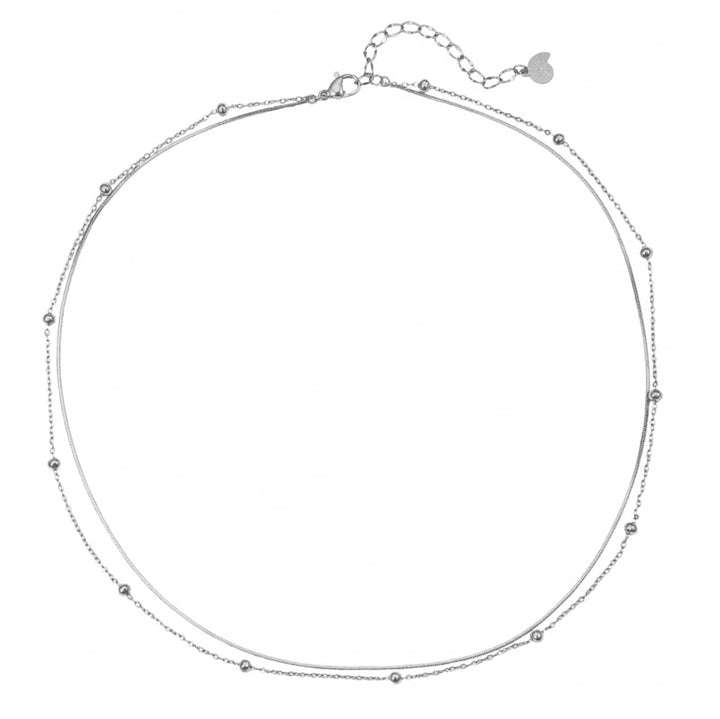 This Layered Bobble Chain Necklace Silver by Hey Happiness offers a sophisticated duo of chains: a shorter tubular-style chain layered over a longer chain accented with tiny metallic beads at regular intervals. The piece is completed with an adjustable back chain featuring a shell charm, allowing for a customized fit. Its delicate construction pairs seamlessly with a variety of looks, from casual to refined, embodying a versatile and feminine elegance.