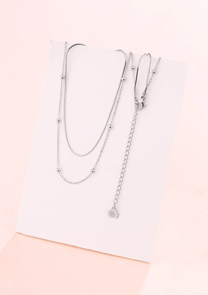 Made from stainless steel. Two chains: one tubular-like short chain and one longer chain with spaced metallic beads. Lobster claw clasp with adjustable extension chain and shell charm.