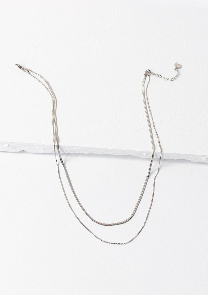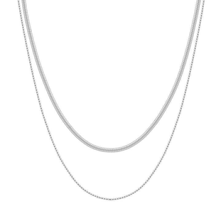These Delicate Layered Necklaces Snake Chain Silver by Hey Happiness are crafted entirely from stainless steel and feature two complementary chains: a snakeskin-textured chain and a fine circular link chain. Both connect with a rounded spring clasp and an adjustable extension chain finished with a tiny shell charm. This versatile and romantic piece adapts seamlessly from casual daywear to sophisticated evening looks, embodying timeless elegance with a subtle edge. The design radiates quiet confidence and graceful femininity.