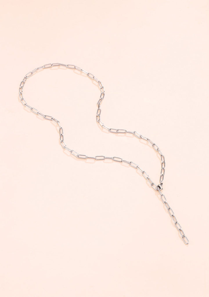 This Chunky Chain Y Necklace by Hey Happiness is a bold stainless steel piece featuring large oval links and a lobster claw clasp that fastens at the center front, forming a stylish Y shape. This versatile necklace can be a subtle complement or a statement focal point, perfect for layering or standalone wear.