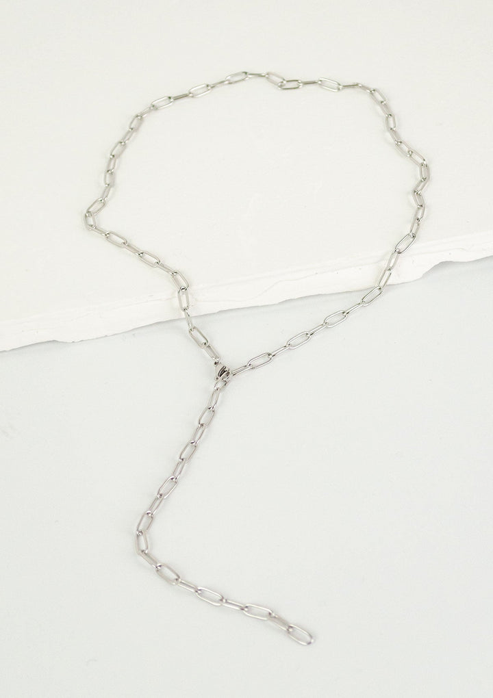 Made from stainless steel. Features large oval chain links. Lobster claw clasp with center front fastening to create Y shape.