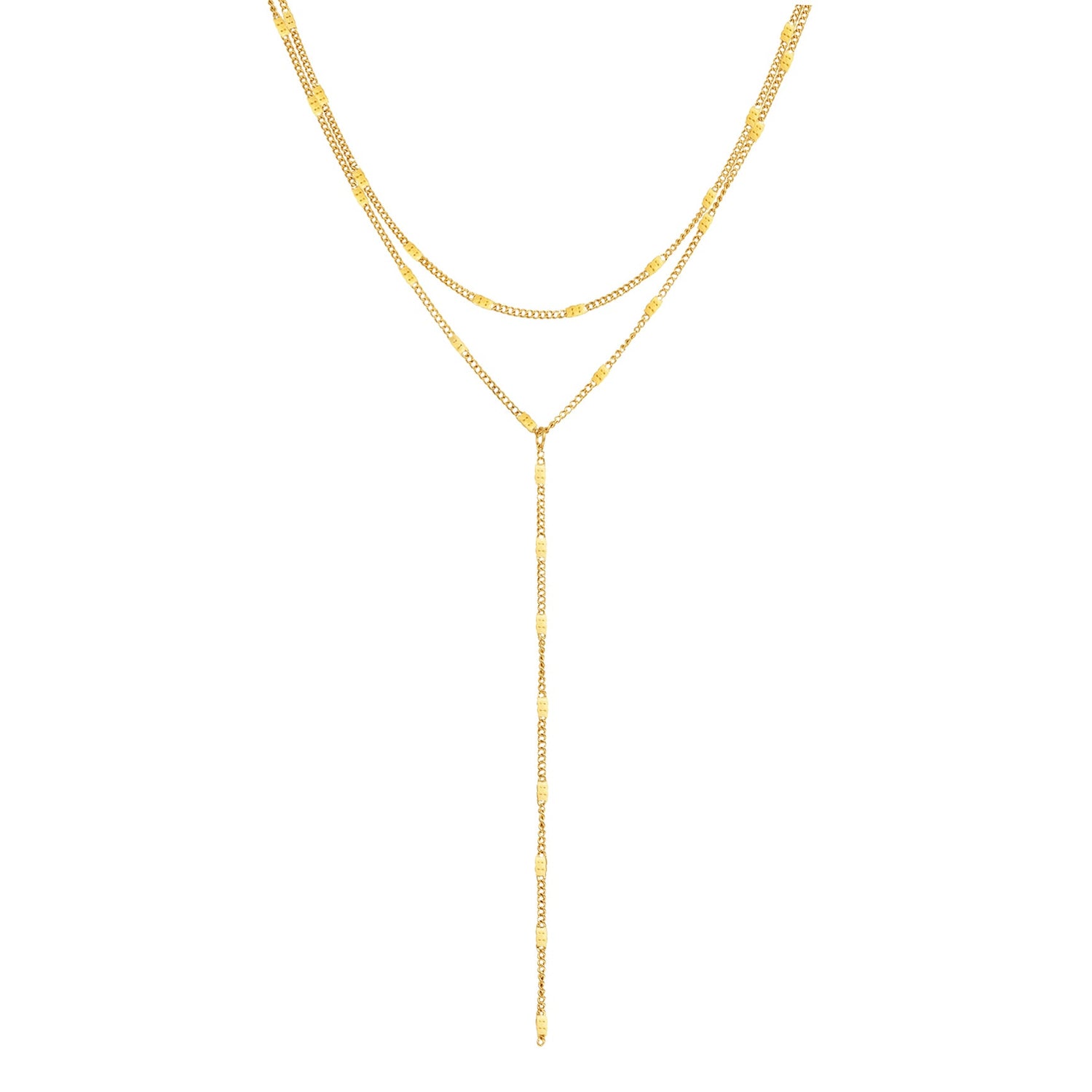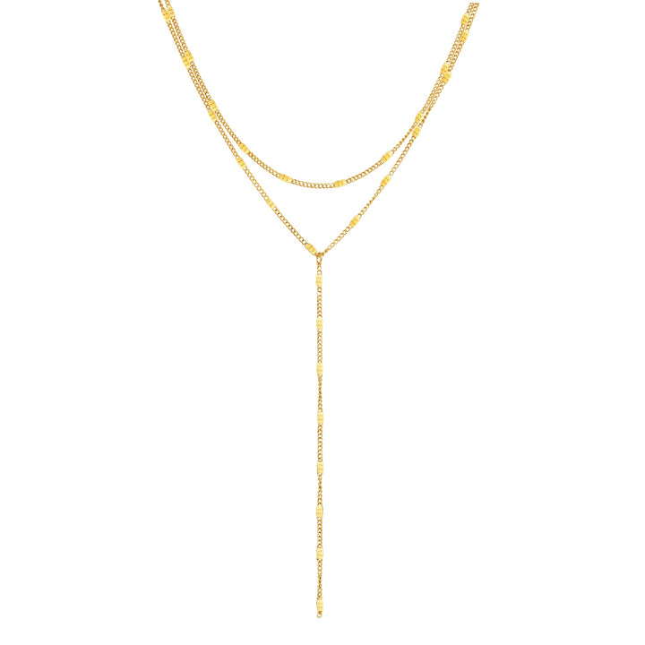 This Layered Y Necklace Gold by Hey Happiness radiates delicate femininity through its two gold chains: a shorter simple neckline chain and a longer Y-shaped chain with a drop “tail” at the center front. Featuring unique flattened links spaced evenly along the chains, the necklace is adjustable via a back chain with a seashell pendant charm. Ideal for pairing with low necklines or elegant dresses, this piece exudes timeless elegance and modern charm.