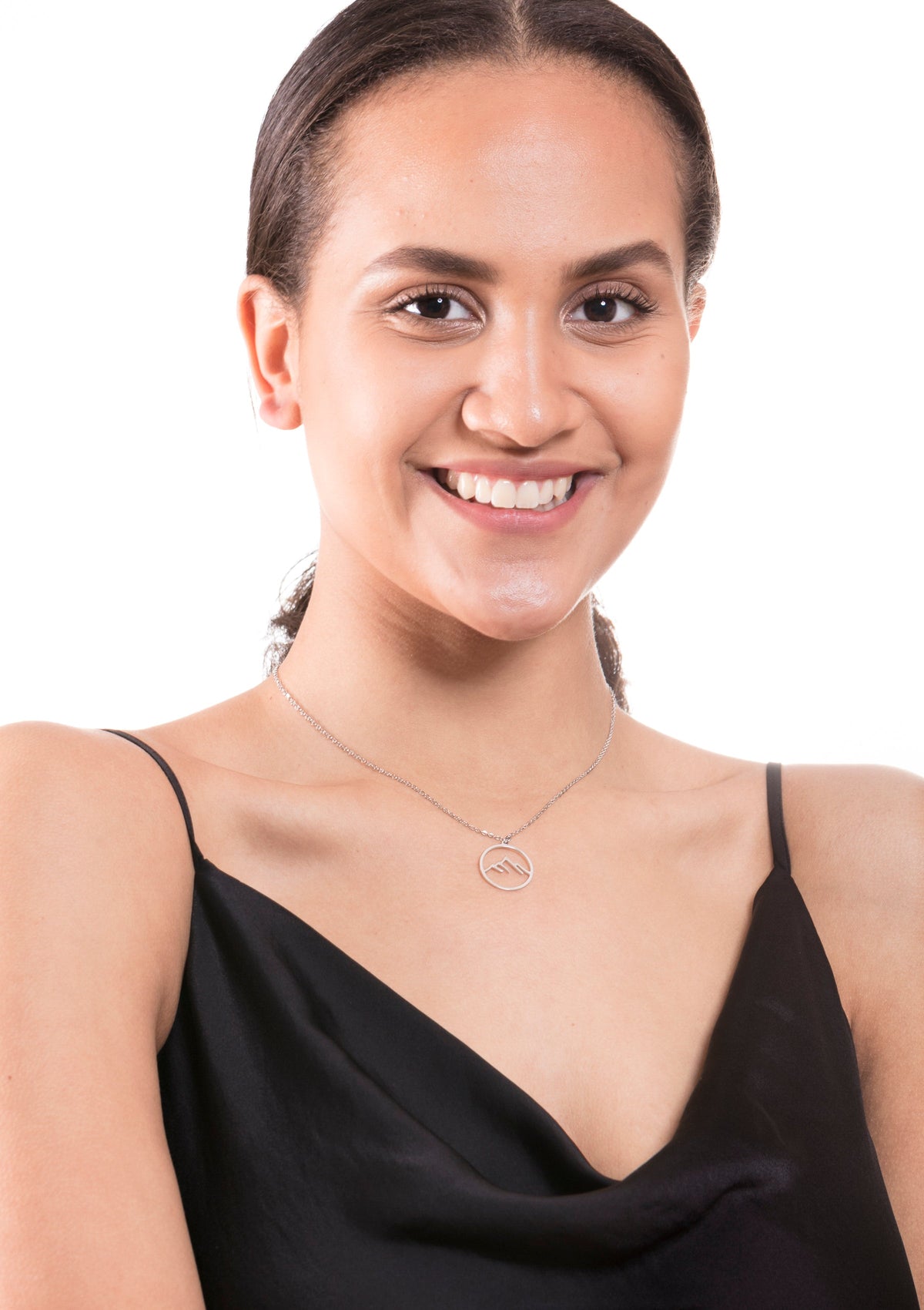 This Mountain Necklace Silver by Hey Happiness features a delicate stainless steel chain with a round hollow pendant showcasing a cut-out mountain range design. Fastened with a lobster claw clasp and adjustable extension chain with a seashell charm, this piece combines subtle elegance with a nature-inspired aesthetic. Also available in gold and rose gold.