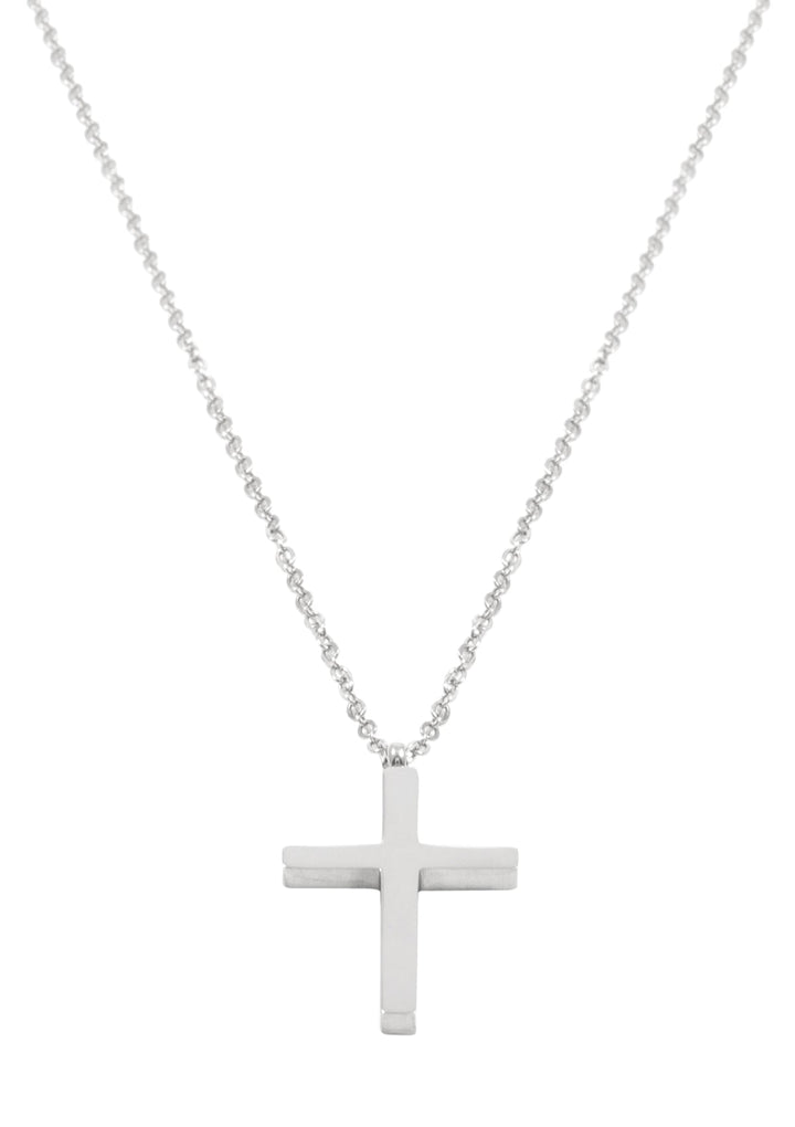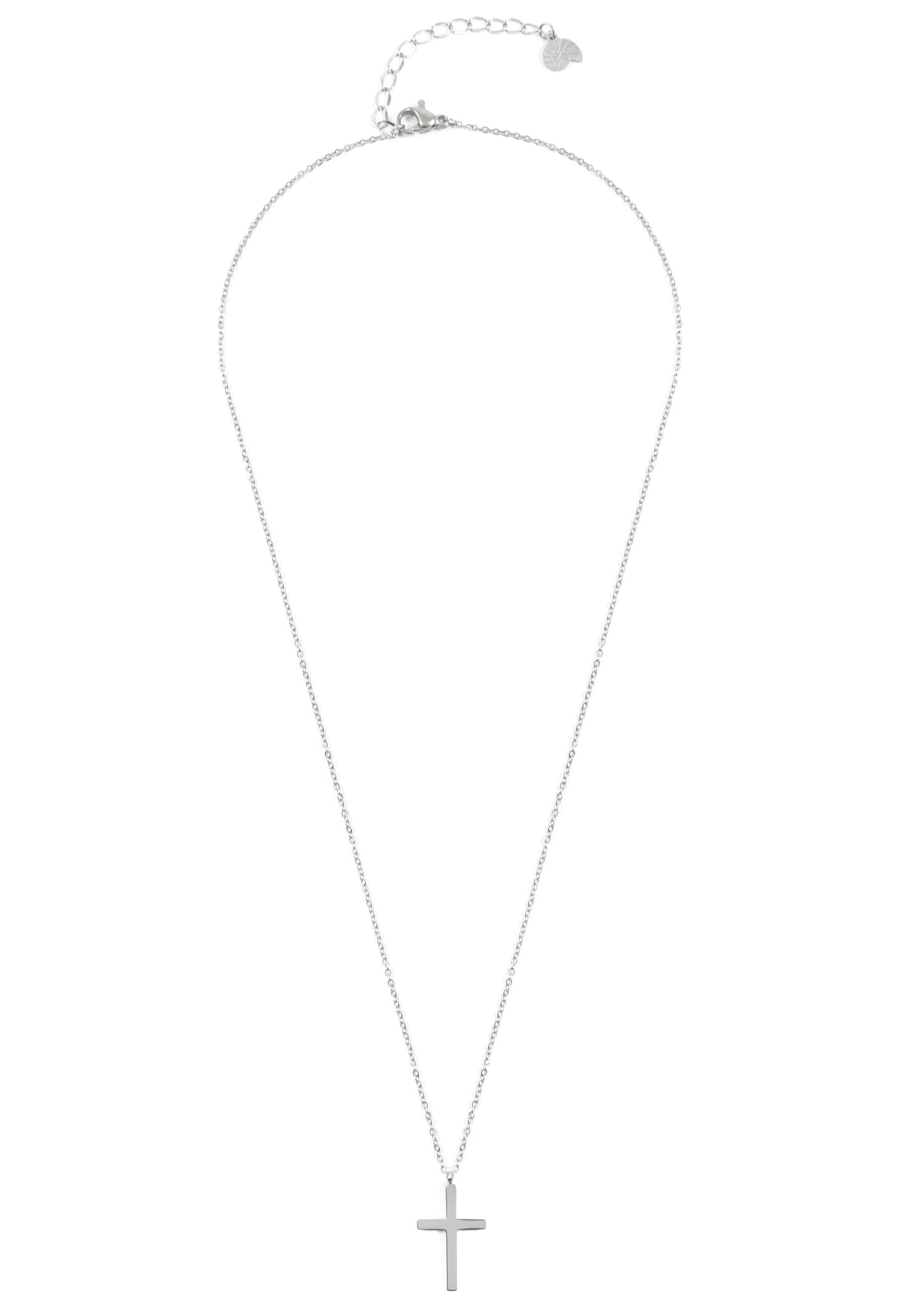 This Cross Pendant Necklace Silver by Hey Happiness features a sterling silver chain with a hanging silver cross pendant at the front. The chain fastens at the back with a clasp and includes a short extension chain with a shell pendant for adjustable length. A modern yet timeless piece that pairs well with layering.