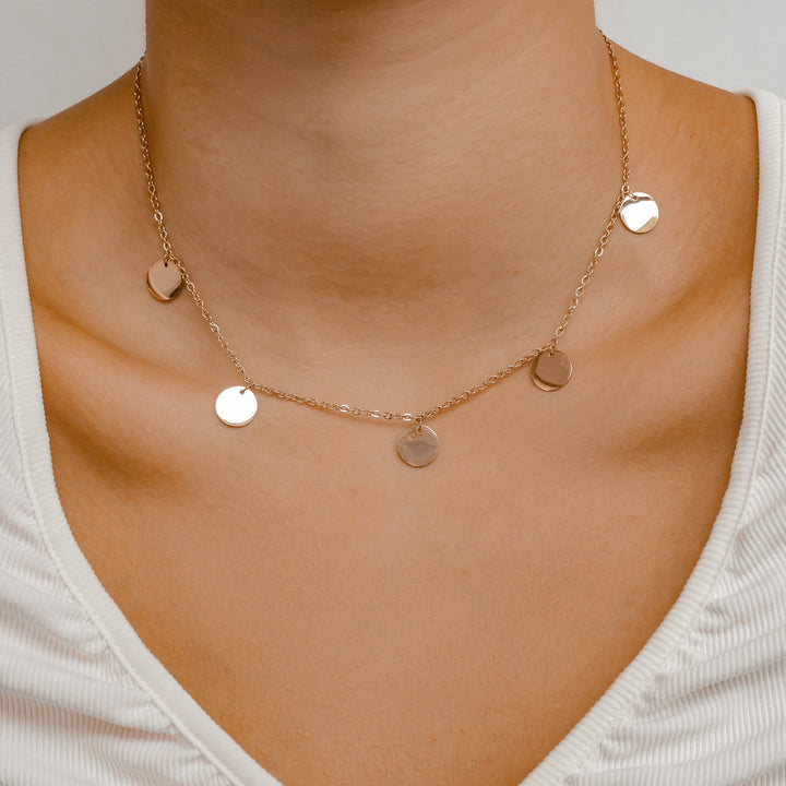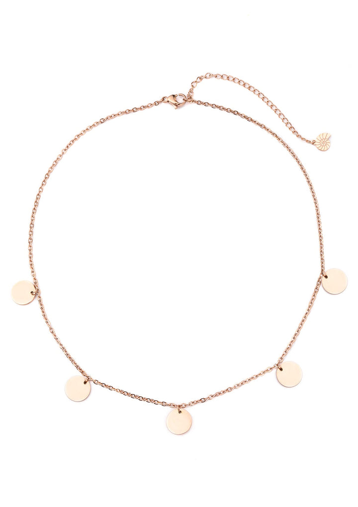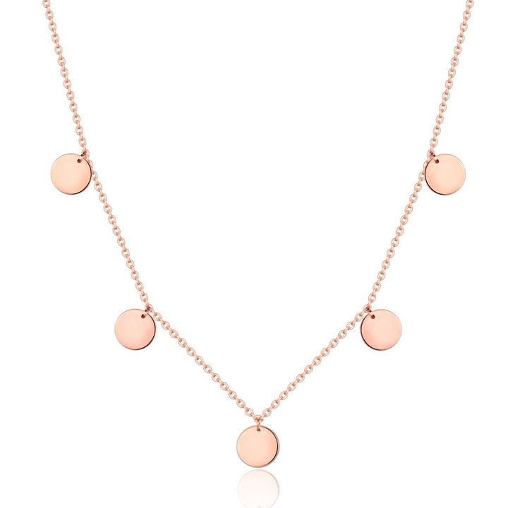 Crafted in rose gold-plated sterling silver. Chain length approx. 40 cm (16 inches). Five circular pendants each approx. 10 mm diameter. Lobster clasp closure.