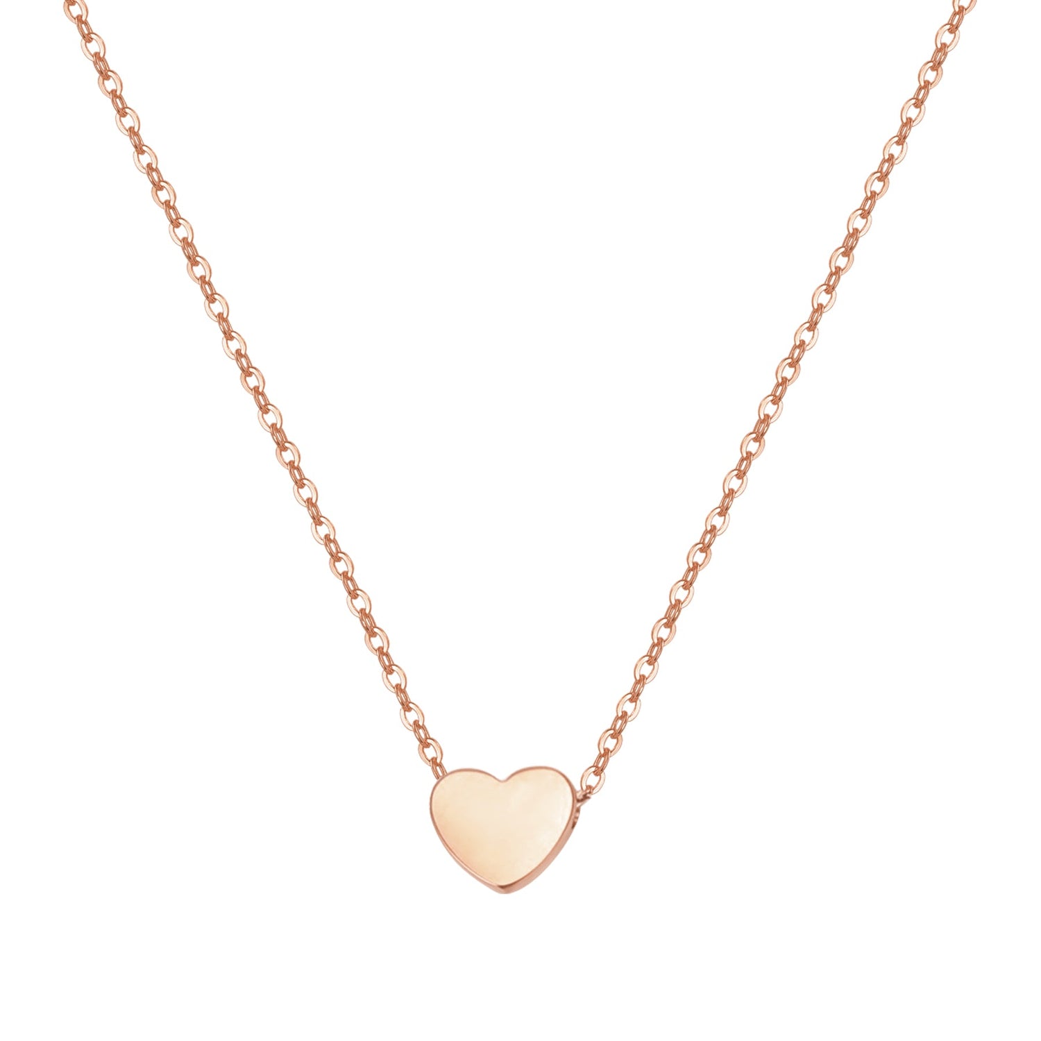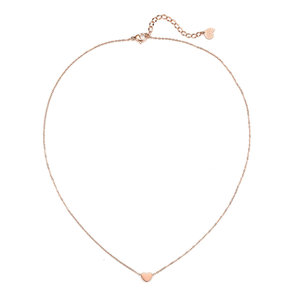 Made from stainless steel plated in rose gold. Features a fine mid-length chain with a rounded sweetheart pendant. Clasp and length details not specified.
