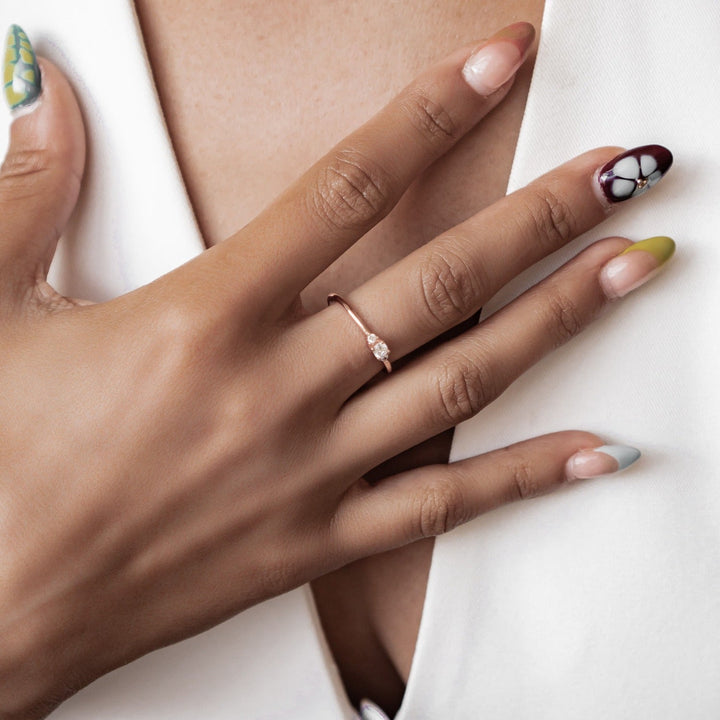 This Slim Trio Ring by Hey Happiness is a slender and elegant piece crafted from 18-karat gold-plated sterling silver. The band features a cluster of three clear zirconia stones at the center front — one larger stone flanked by two smaller ones — creating a refined focal point. Its pared-back design pairs beautifully with both feminine styles and sharp tailoring, offering timeless versatility.
