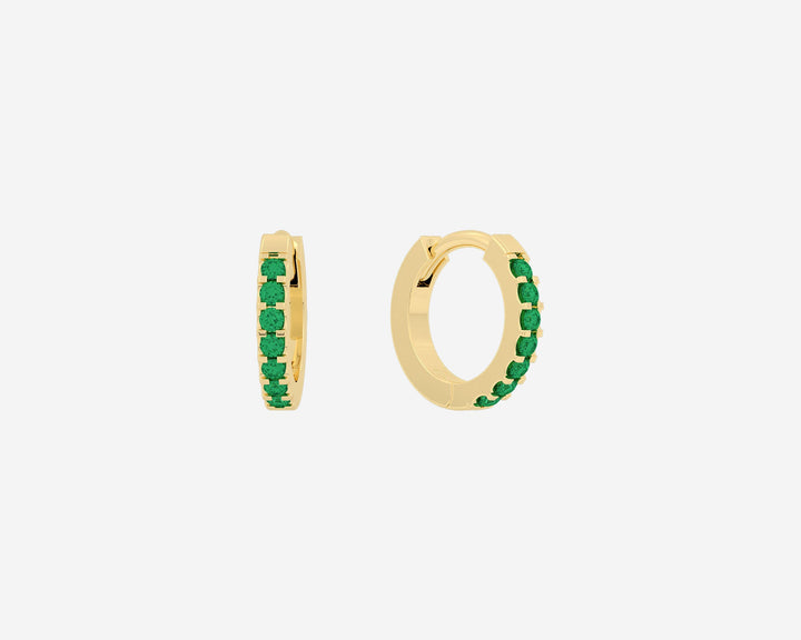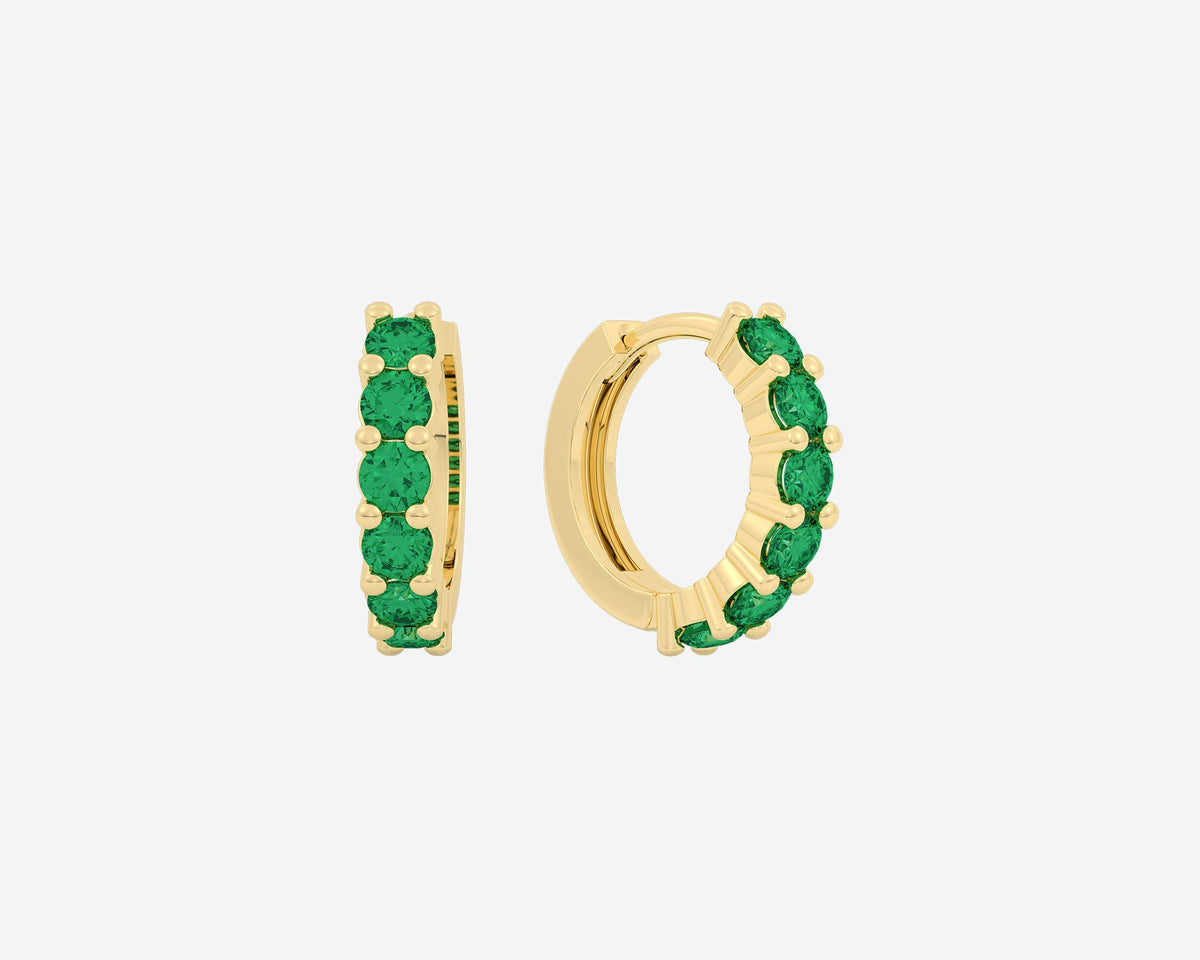 The Gem Huggies by Holden are elegant solid 14k gold earrings accented with ethically sourced lab-grown gemstones including ruby, sapphire, emerald, and alexandrite. Available in yellow or white gold with a 1.5mm width, these huggie hoops offer delicate sparkle and support social impact through donations to The Trevor Project.